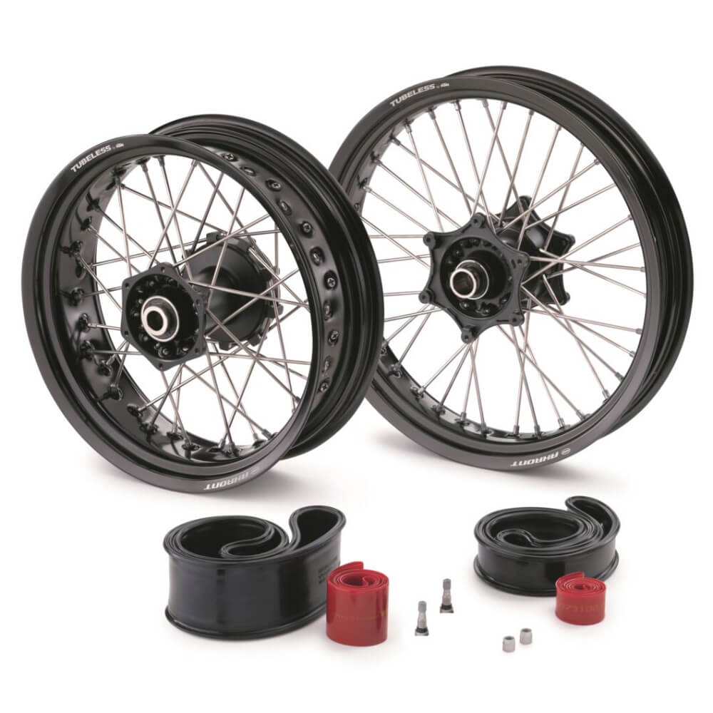 Преобразите свой KTM с помощью колесной пары 6070990114430, тщательно разработанной для улучшения ваших впечатлений от езды. Этот комплексный комплект включает в себя все необходимые компоненты для легкого преобразования стандартных литых дисков в высокопроизводительные колеса со спицами. Разработанное для обеспечения универсальности, переднее колесо имеет размер 3,0 19 дюйма, в то время как заднее колесо имеет размер 5,0 17 дюймов, что обеспечивает оптимальную совместимость и повышенную маневренность на различных участках местности.